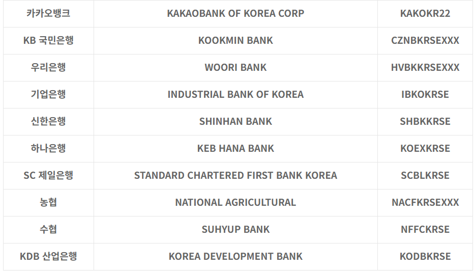 6. 은행별 영어 명과 SWIFT 코드는 아래를 참조하시면 됩니다.