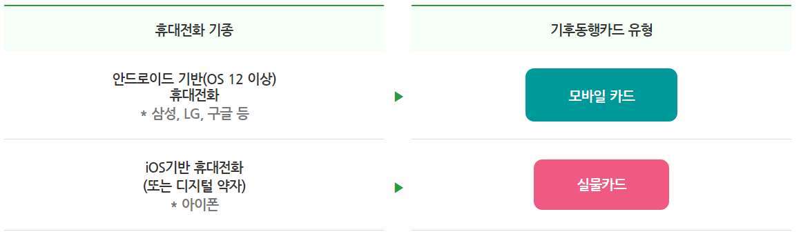 기후 동행카드는 휴대 전화 기종에 따라 모바일 카드 또는 실물 카드로 사용할 수 있습니다.