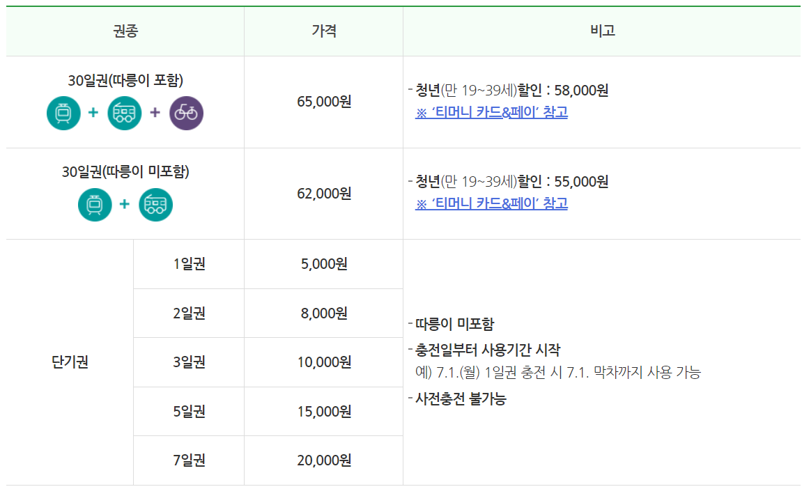 기존 ‘기후동행카드’는 따릉이 사용 유무에 따라 62,000원‧65,000원 2종 중에서만 선택할 수 있었는데, 7월 1일부터는 단기권(1~7일)으로 그 종류가 다양해진다. 외국인 관광객과 서울 방문객을 위한 ‘단기권’은 ▴1일권(5,000원) ▴2일권(8,000원) ▴3일권(10,000권) ▴5일권(15,000원) ▴7일권 (20,000원) 총 5종으로 머무는 기간 또는 개인 일정에 따라 구매‧사용할 수 있다.