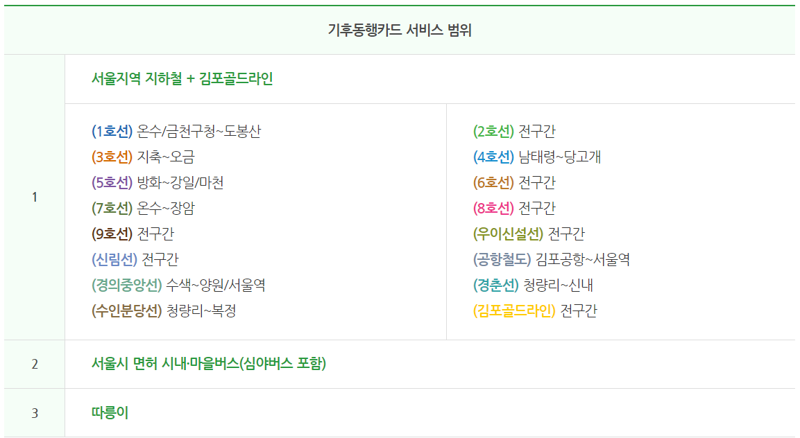 기후 동행카드로 승하차 가능한 지하철 노선도 확인은 아래를 클릭하시기 바랍니다.
