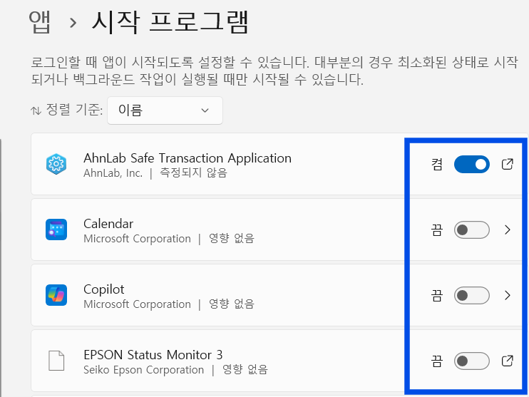 - 영향도 확인: '시작 시 영향' 항목을 보면 어떤 앱이 부팅 속도를 많이 늦추는지(높음, 중간, 낮음) 확인할 수 있습니다.