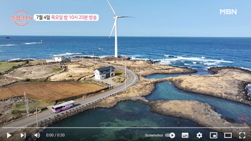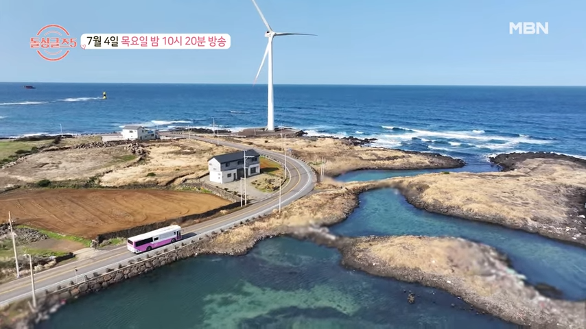 제주도의 광활한 바다를 배경으로 돌싱들을 태운 버스가 달려갑니다.