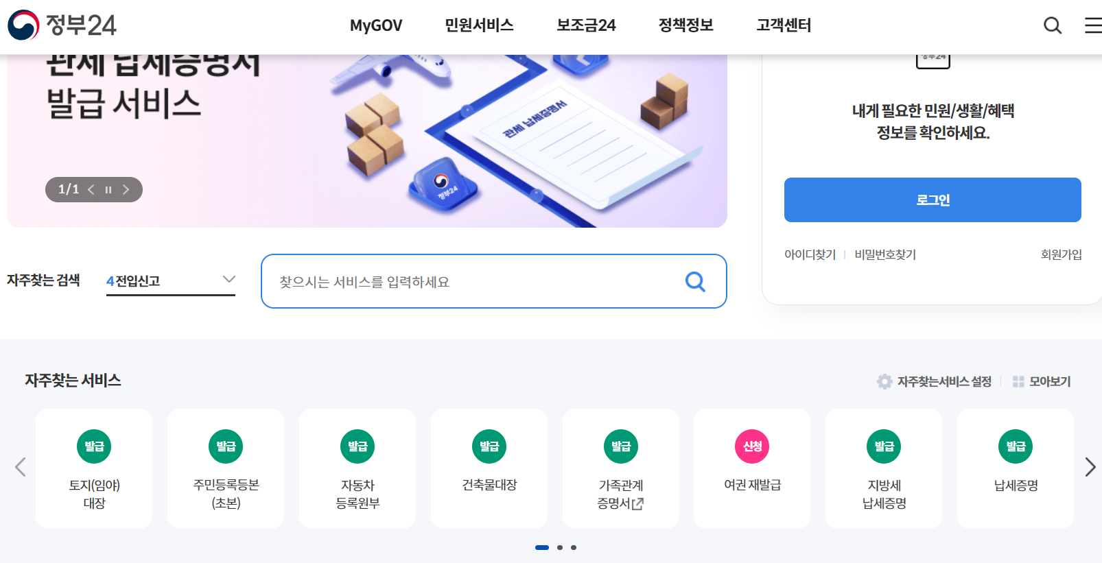 정부 24 사이트를 방문하여 '여권 재발급'을 검색하거나 자주 찾는 서비스의 여권 재발급을 클릭합니다.