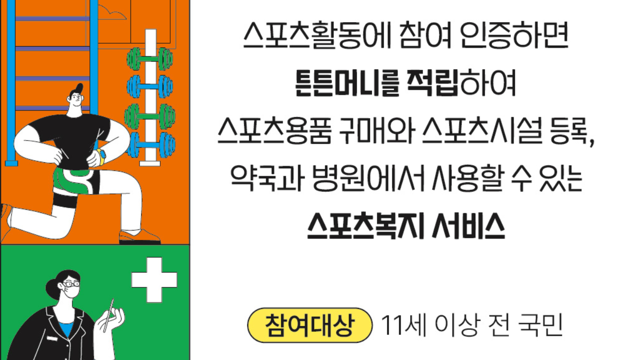 국민체육진흥공단에서는 스포츠활동 인센티브인 ‘튼튼머니’ 사업을 운영하고 있습니다. 스포츠활동 참여시 튼튼머니를 적립해주고, 이를 병원이나 약국, 또는 스포츠용품 구매 및 스포츠시설 등록 등에 사용할 수 있도록 하는 것입니다.