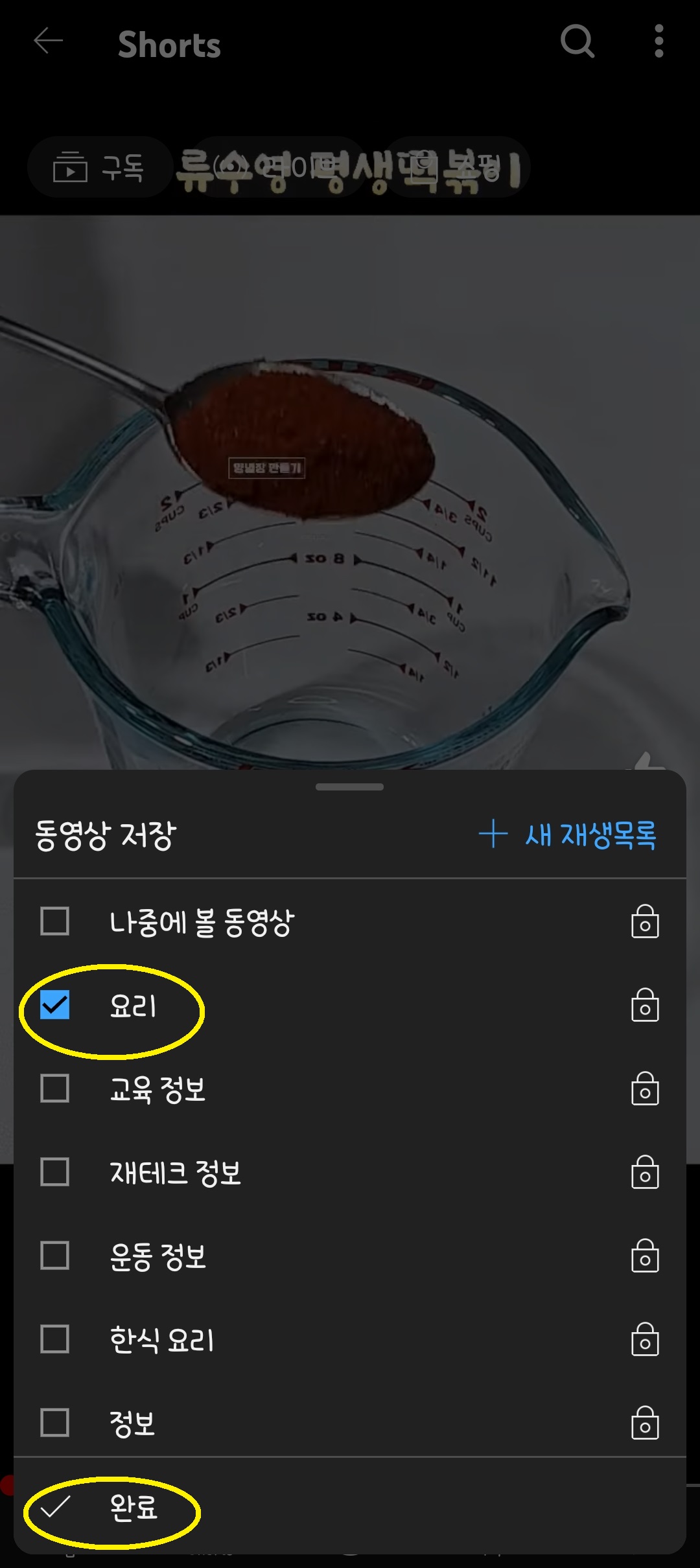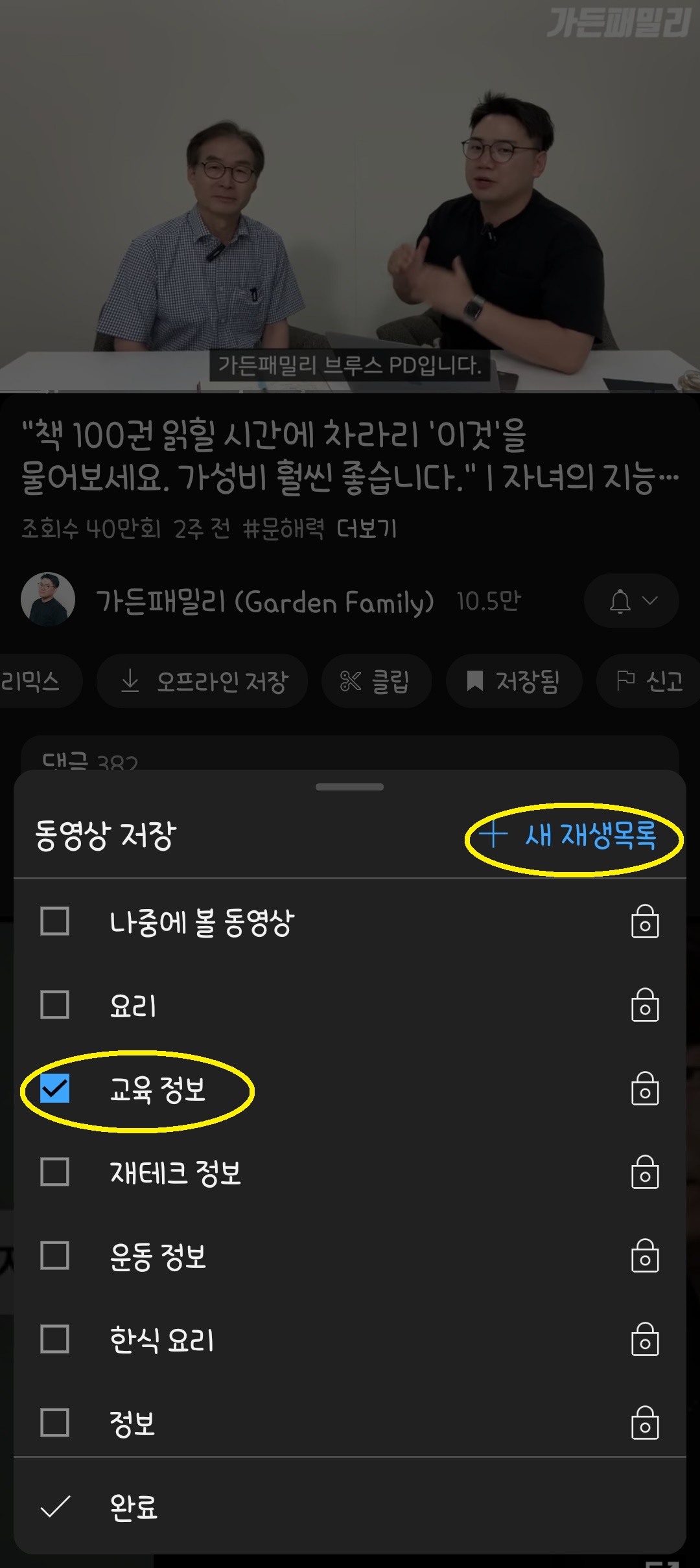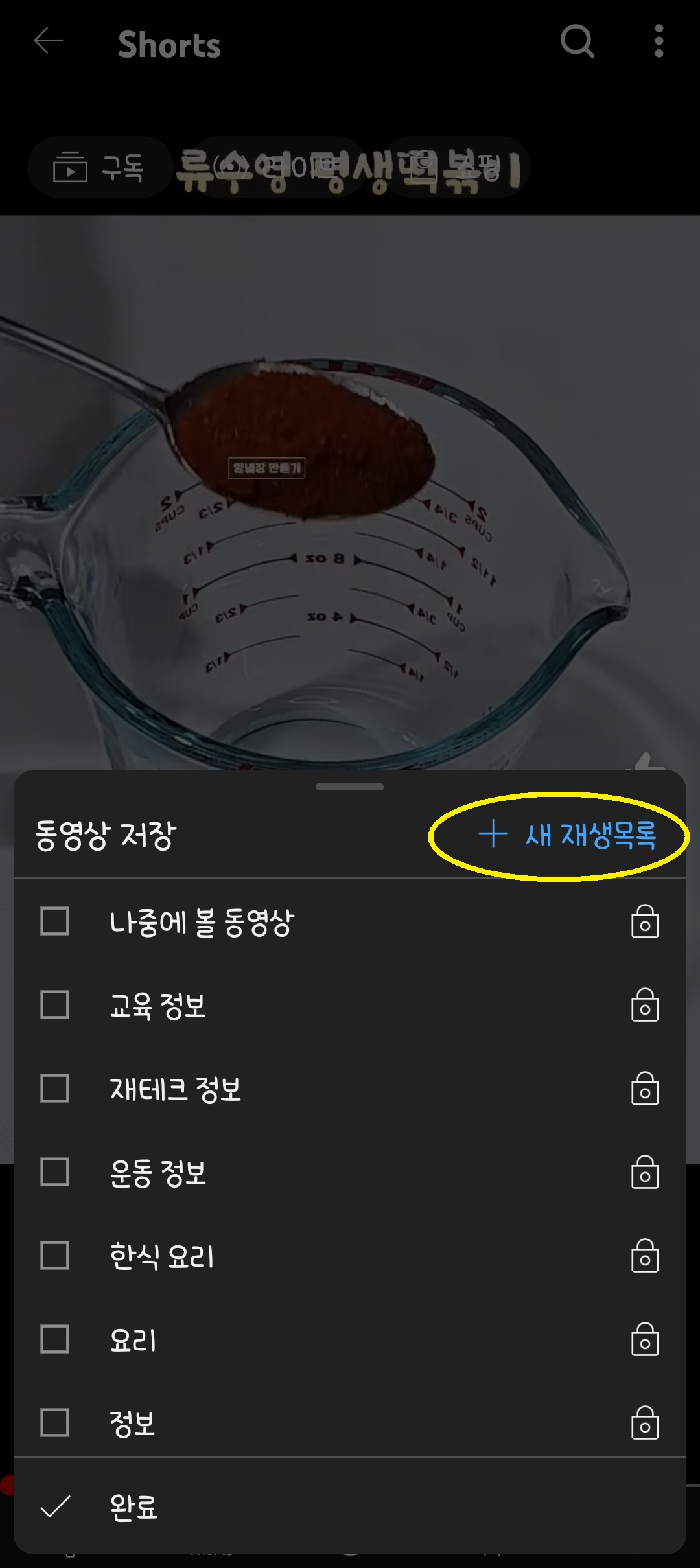 2) 기존 카테고리나 '새 재생목록'을 클릭해 원하는 목록을 만들고 '완료'를 누릅니다.